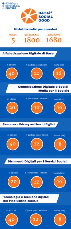 Data for Social Good è un progetto selezionato e sostenuto dal Fondo per la Repubblica Digitale Impresa sociale che ha dedicato una linea formativa specifica agli operatori dei servizi sociali, rafforzandone le competenze digitali e la capacità di utilizzare strumenti e tecnologie in modo consapevole.